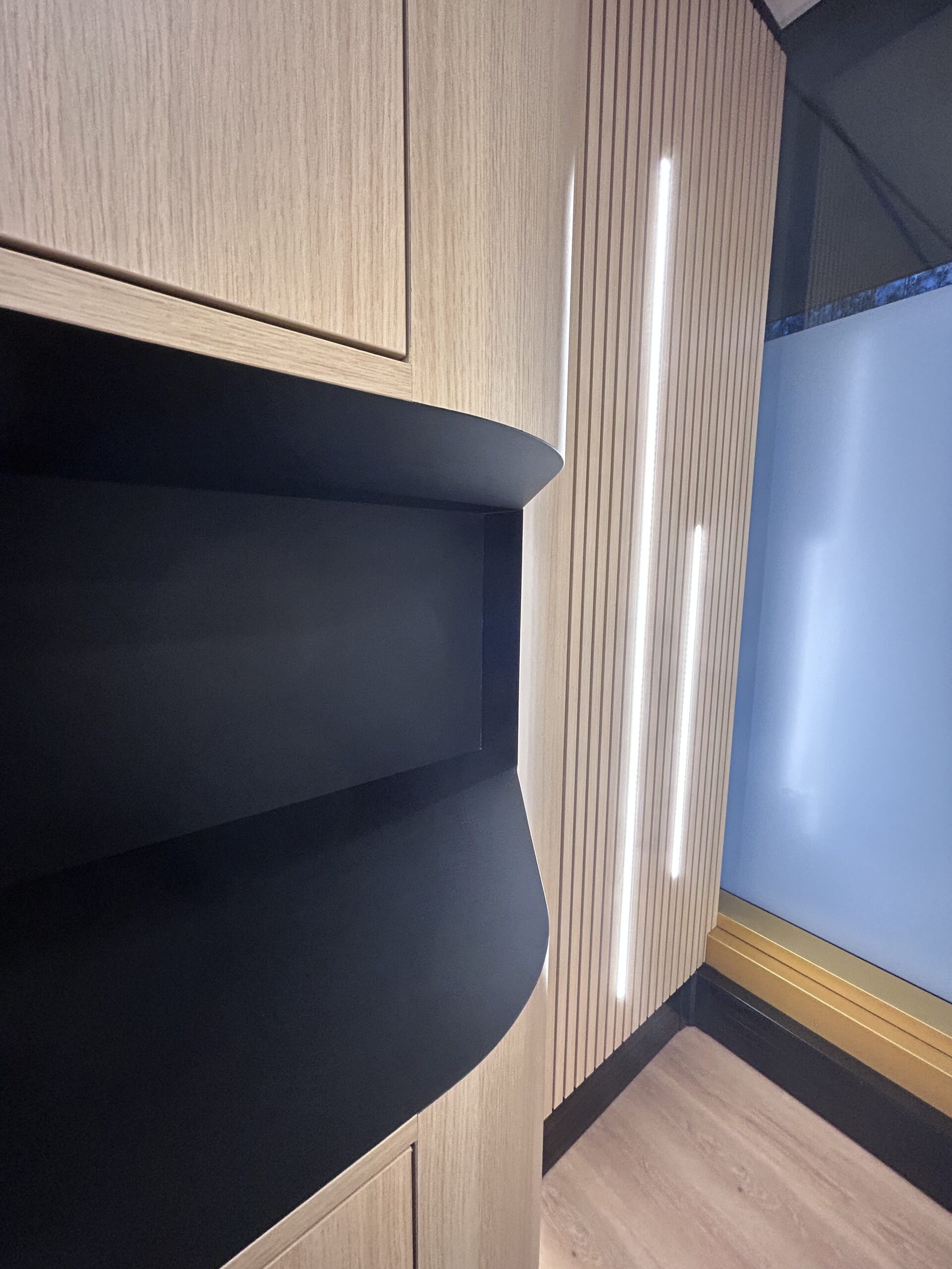 Traitement soigné des matériaux, des lignes et de l’éclairage.