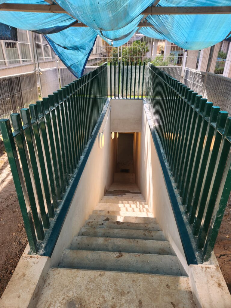Création d’une issue de secours avec escalier béton et mise en conformité sécurité.